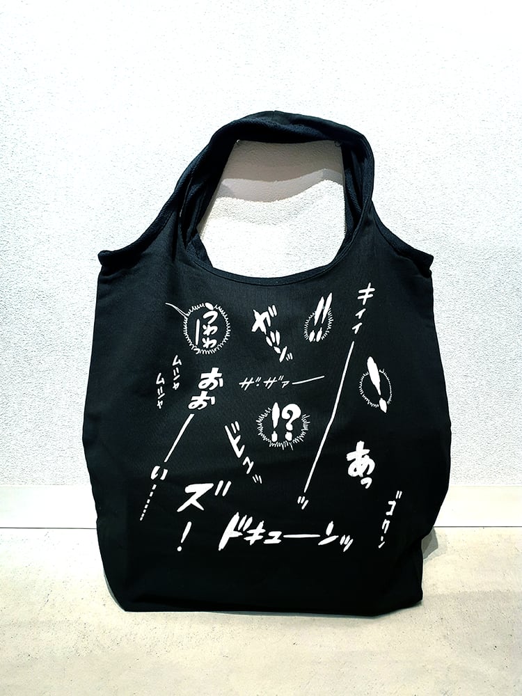さいとう・たかをならではの“!?“や”おおーい……“などの「オノマトペ」のパターンのマルシェバッグです。
